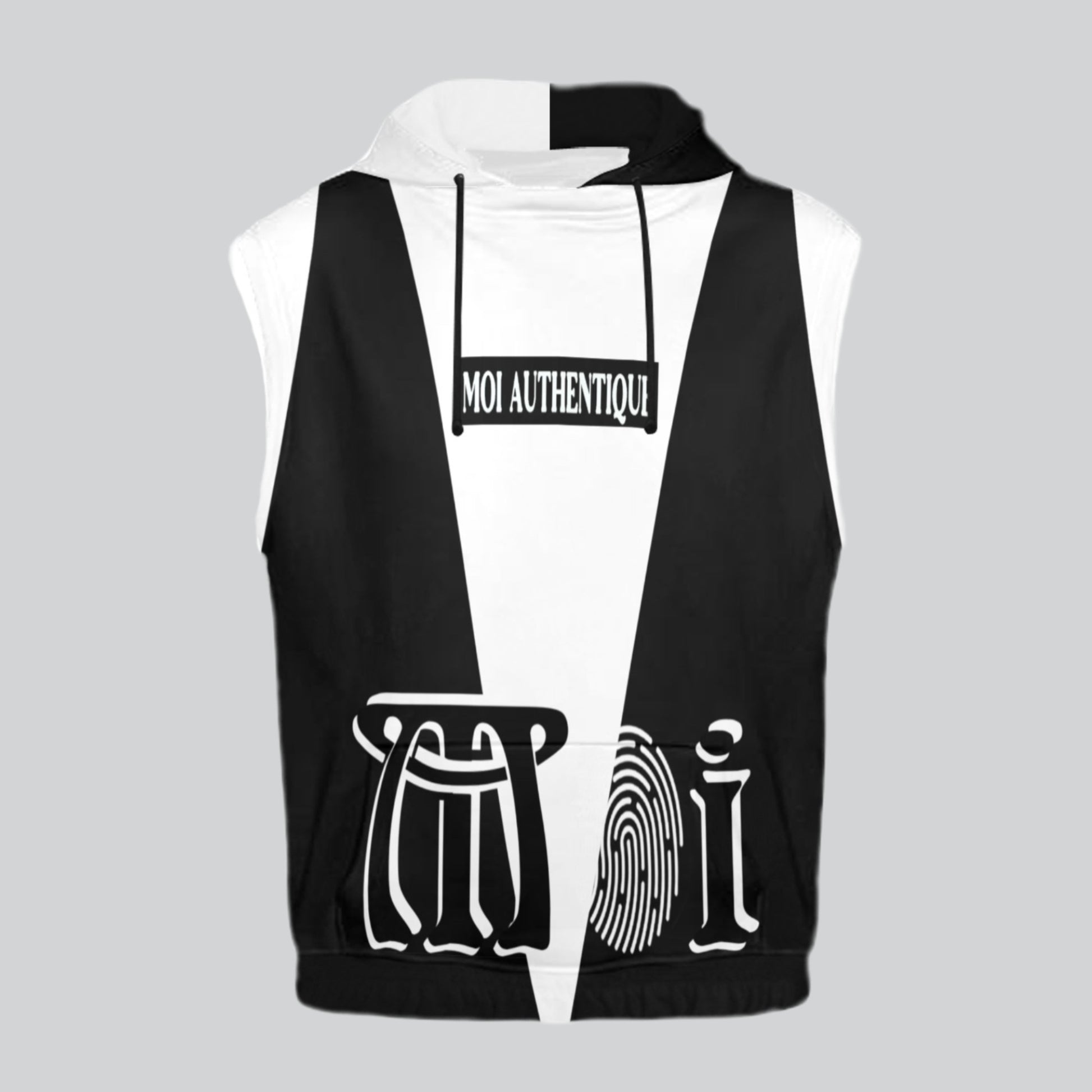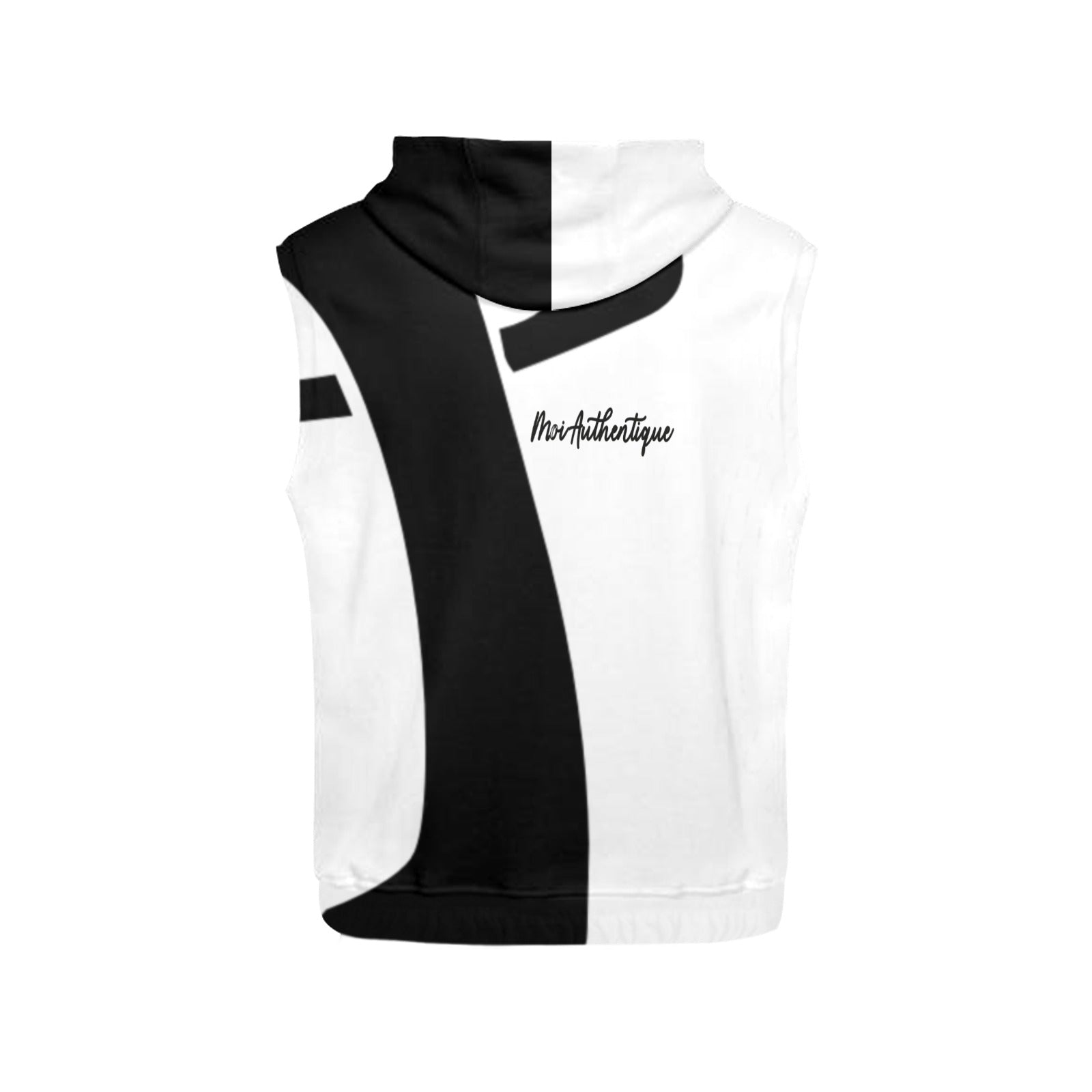 Moi Authentique, a black and white sleeveless super soft hoodie for men, is a comfortable and stylish classic-cut hoodie that is perfect for many sporting venues due to its lightweight design. It features a taped neck and shoulders for added comfort and style.